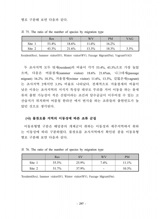 297 75. The ratio of the number of species by migration type Res SV WV PM VAG Site 1 53.4% 18.6% 11.6% 16.2% Site 2 43.3% 21.6% 13.3% 18.3% 3.3% resident 53.4%, 43.3% , summer visitor 18.6% 21.6%m, passage migrant 16.2% 18.3%, winter visitor 11.6%, 13.3%, vagrant 2 3.3% 76. The ratio of the number of species by migration type Res SV WV PM Site 1 55.5% 25.9% 7.4% 11.1% Site 2 51.7% 37.9% 10.3%