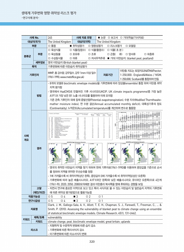 320 생태계 기후변화 영향·취약성·리스크 평가 -연구사례 분석- 사례 No. 245 사례 자료 유형 ■ 논문 □ 보고서 □ 기타 학술/기사자료 대상지 국가 The United Kingdom 대상지 지역 The United Kingdom 부문 □ 통합 ■ 취약성평가 □ 영향성평가 □ 리스크평가 □ 모델링 분류군 부문 □ 육상식물 □ 식물 침엽수 □ 식물 활엽수 □ 식물 초 본 □ 육상동물 □ 포유류 □ 조류 □ 곤충 류 □ 양서류 □ 파충류 □ 수상동식물 □ 어류 □ 저서무척추류 ■ 기타 이탄습지; blanket peat, peatland 세부정보 영국 이탄습지 British blanket peat 목적 기후변화에 따른 이탄습지 취약성평가 기후인자 MMP, 총 강수량, 강우일수, 강우 1mm 이상 일수 19...