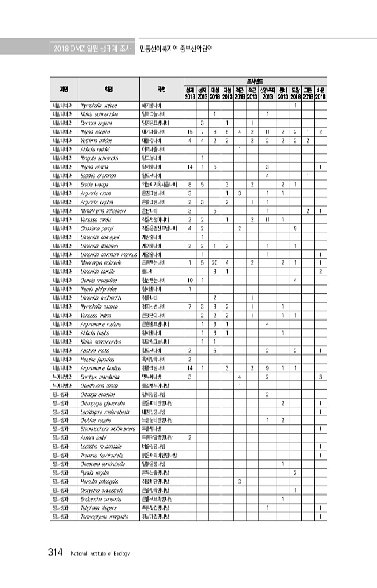 2018 DMZ 일원 생태계 조사 민통선이북지역 중부산악권역 314 ? National Institute of Ecology 과명 학명 국명 조사년도 성재 2018 성재 2013 대성 2018 대성 2013 적근 2018 적근 2013 산양+주파 2013 흰바 2013 도창 2018 고둔 2018 비운 2018 네발나비과 Nymphalis urticae 쐐기풀나비 1 네발나비과 Kirinia epimenides 알락그늘나비 1 1 네발나비과 Damora sagana 암검은표범나비 3 1 1 네발나비과 Neptis sappho 애기세줄나비 15 7 8 5 4 2 11 2 2 1 2 네발나비과 Ypthima baldus 애물결나비 4 4 2 2 2 2 2 2 2 네발나비과 Aldania raddei 어리세줄나비...