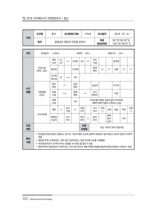 2018 전국해안사구 자연환경조사 충남 312 ? National Institute of Ecology 지역 사구명 꽃지 조사번호 기호 CN24 조사일자 2018. 10. 14. 위치 충청남도 태안군 안면읍 승언리 좌표 중심좌표 36°29′04.52″N 126°20′09.57″E 규모 최대길이 1,340m, 최대폭 40m, 해발고도 23m 사구 현황 인공시설 정의, 강도 해안 도로 A1, A2 ++ 산책로 B3 ++ 부두 시설 방파제 철조망 도류제 돌제 제티 G ++ 건물 H ++ 사구복 원시설 I0 +++ 기타 이용현황 강도 해수 욕장 ++ 삼림 욕장 농경지 주거지 상업 시설 +++ 골재 채취 ++ 군사 훈련지 무덤 생태 교육 기타 리조트를 비롯한 상업시설이 위치하며, 배후지역에 건물이 신축되고 있음 서식...