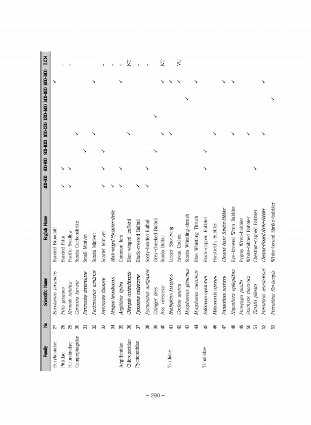 Family No Scientific Name English Name 400-600 600-800 800-1000 1000-1200 1200-1400 1400-1600 1600-1800 IUCN Eurylaimidae 27 Eurylaimus javanicus Banded Broadbill Pittidae 28 Pitta guajana Banded Pitta Hirundinidae 29 Hirundo tahitica Pacific Swallow Campephagidae 30 Coracina larvata Sunda Cuckooshrike 31 Pericrocotus cinnamomeus Small Minivet 32 Pericrocotus miniatus Sunda Minivet 33 Pericrocotus...