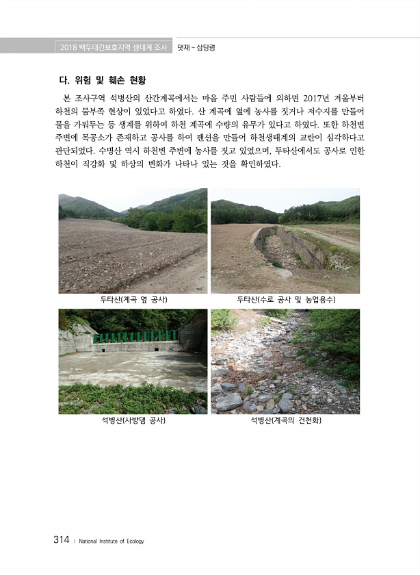 2018 백두대간보호지역 생태계 조사 댓재 삽당령 314 ? National Institute of Ecology 다. 위험 및 훼손 현황 본 조사구역 석병산의 산간계곡에서는 마을 주민 사람들에 의하면 2017년 겨울부터 하천의 물부족 현상이 있었다고 하였다. 산 계곡에 옆에 농사를 짓거나 저수지를 만들어 물을 가둬두는 등 생계를 위하여 하천 계곡에 수량의 유무가 있다고 하였다. 또한 하천변 주변에 목공소가 존재하고 공사를 하여 팬션을 만들어 하천생태계의 교란이 심각하다고 판단되었다. 수병산 역시 하천변 주변에 농사를 짓고 있었으며, 두타산에서도 공사로 인한 하천이 직강화 및 하상의 변화가 나타나 있는 것을 확인하였다. 두타산 계곡 옆 공사 두타산 수로 공사 및 농업용수 석병산 사방댐 공사 석병산 계곡의 건...