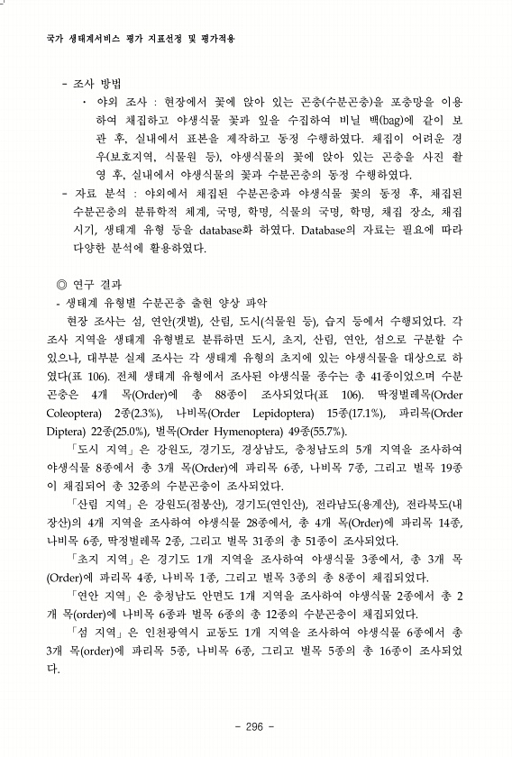 국가 생태계서비스 평가 지표선정 및 평가적용 296 조사 방법 · 야외 조사 현장에서 꽃에 앉아 있는 곤충 수분곤충 을 포충망을 이용 하여 채집하고 야생식물 꽃과 잎을 수집하여 비닐 백 bag 에 같이 보 관 후, 실내에서 표본을 제작하고 동정 수행하였다. 채집이 어려운 경 우 보호지역, 식물원 등 , 야생식물의 꽃에 앉아 있는 곤충을 사진 촬 영 후, 실내에서 야생식물의 꽃과 수분곤충의 동정 수행하였다. 자료 분석 야외에서 채집된 수분곤충과 야생식물 꽃의 동정 후, 채집된 수분곤충의 분류학적 체계, 국명, 학명, 식물의 국명, 학명, 채집 장소, 채집 시기, 생태계 유형 등을 database화 하였다. Database의 자료는 필요에 따라 다양한 분석에 활용하였다. ◎ 연구 결과 생태계 유형별 수분곤충 출...