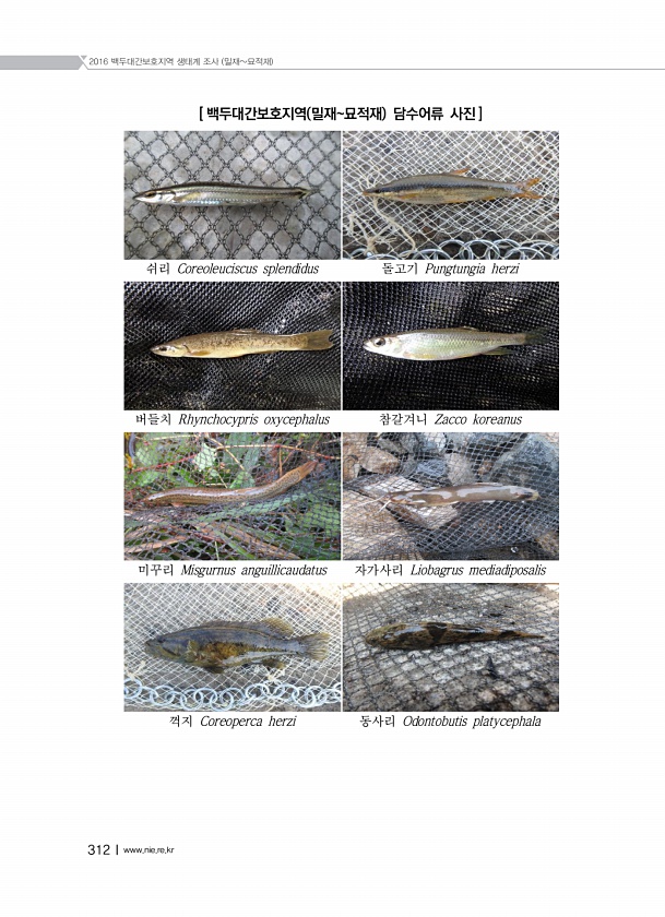 2016 백두대간보호지역 생태계 조사 밀재묘적재 312Ⅰwww.nie.re.kr [ 백두대간보호지역 밀재묘적재 담수어류 사진 ] 쉬리 Coreoleuciscus splendidus 돌고기 Pungtungia herzi 버들치 Rhynchocypris oxycephalus 참갈겨니 Zacco koreanus 미꾸리 Misgurnus anguillicaudatus 자가사리 Liobagrus mediadiposalis 꺽지 Coreoperca herzi 동사리 Odontobutisplatycephala