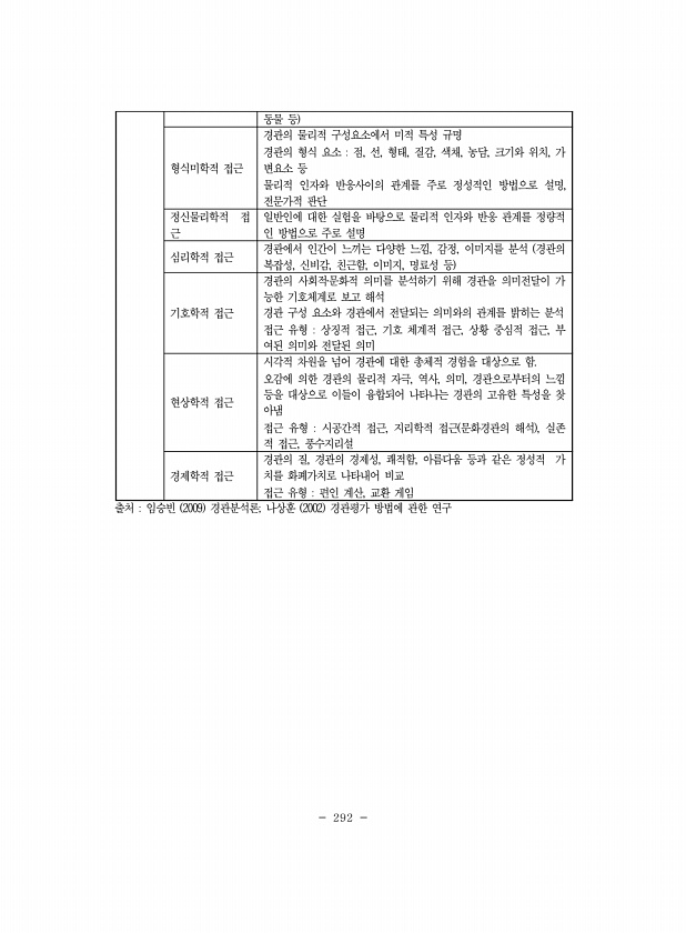 292 동물 등 형식미학적 접근 경관의 물리적 구성요소에서 미적 특성 규명 경관의 형식 요소 점, 선, 형태, 질감, 색채, 농담, 크기와 위치, 가 변요소 등 물리적 인자와 반응사이의 관계를 주로 정성적인 방법으로 설명, 전문가적 판단 정신물리학적 접 근 일반인에 대한 실험을 바탕으로 물리적 인자와 반응 관계를 정량적 인 방법으로 주로 설명 심리학적 접근 경관에서 인간이 느끼는 다양한 느낌, 감정, 이미지를 분석 경관의 복잡성, 신비감, 친근함, 이미지, 명료성 등 기호학적 접근 경관의 사회적?문화적 의미를 분석하기 위해 경관을 의미전달이 가 능한 기호체계로 보고 해석 경관 구성 요소와 경관에서 전달되는 의미와의 관계를 밝히는 분석 접근 유형 상징적 접근, 기호 체계적 접근, 상황 중심적 접근, 부 여된 ...