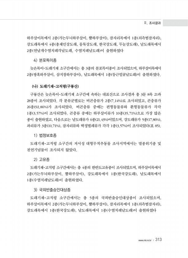 Ⅱ. 조사결과 www.nie.re.kr ? 313 하루살이목에서 2종 가는무늬하루살이, 뿔하루살이 , 잠자리목에서 1종 쇠측범잠자리 , 강도래목에서 4종 총채민강도래, 뭉툭강도래, 한국강도래, 두눈강도래 , 날도래목에서 2종 연날개수염치레각날도래, 수염치레날도래 이 출현하였다 4 분포특이종 늦은목이도래기재 소구간에서는 총 3종의 분포특이종이 조사되었으며, 하루살이목에서 2종 쌍혹하루살이, 삼지창하루살이 , 날도래목에서 1종 둥근얼굴날도래 이 출현하였다. 나 도래기재고직령 구룡산 구룡산은 늦은목이도래기재 소구간에 속하는 대표산으로 조사결과 총 3문 8목 21과 28종이 조사되었다. 각 분류군별로는 비곤충류가 2종 7.14% 로 조사되었고, 곤충류가 26종 92.86% 가 조사되었다. 비곤충류 중에는 편형동물류...