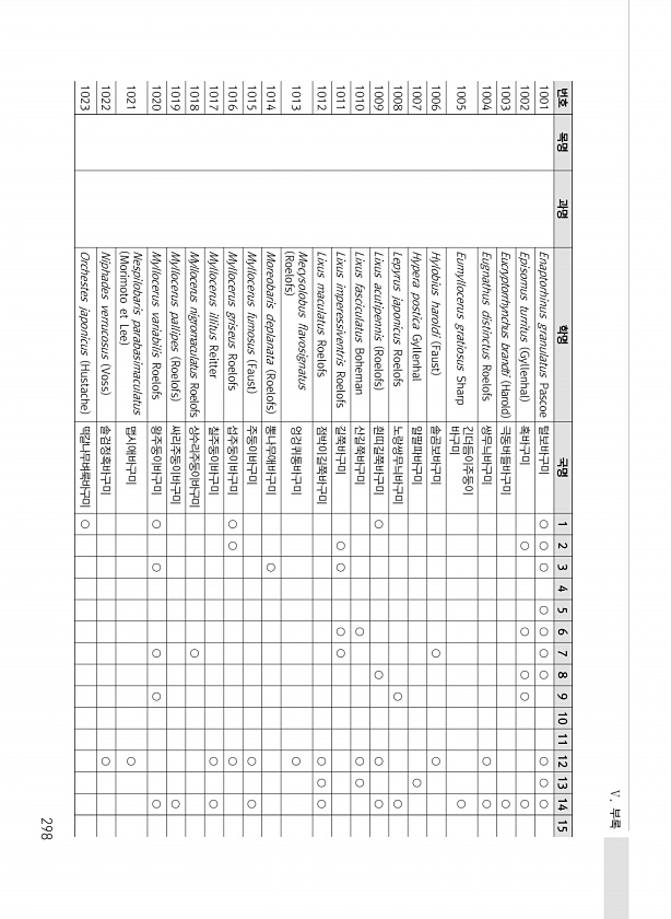 Ⅴ. 부록 298 번호 목명 과명 학명 국명 1 2 3 4 5 6 7 8 9 10 11 12 13 14 15 1001 Enaptorhinus granulatus Pascoe 털보바구미 ○ ○ ○ ○ ○ ○ ○ ○ ○ ○ 1002 Episomus turritus Gyllenhal 혹바구미 ○ ○ ○ ○ ○ 1003 Eucryptorrhynchus brandti Harold 극동버들바구미 ○ 1004 Eugnathus distinctus Roelofs 쌍무늬바구미 ○ ○ 1005 Eumyllocerus gratiosus Sharp 긴더듬이주둥이 바구미 ○ 1006 Hylobius haroldi Faust 솔곰보바구미 ○ ○ 1007 Hypera postica Gyllenhal 알팔파바구미 ○ 1008 Lepyr...