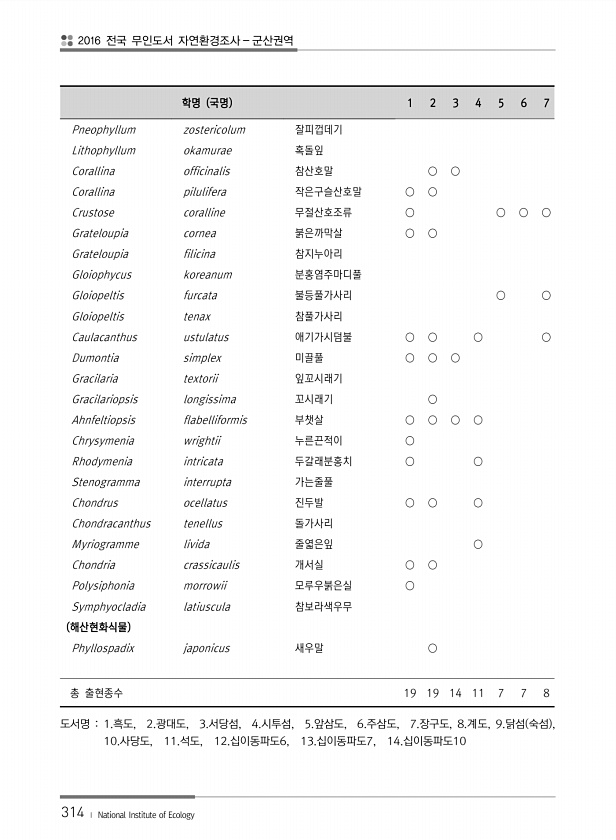 2016 전국 무인도서 자연환경조사 군산권역 314 ? National Institute of Ecology 학명 국명 1 2 3 4 5 6 7 Pneophyllum zostericolum 잘피껍데기 Lithophyllum okamurae 혹돌잎 Corallina officinalis 참산호말 ○ ○ Corallina pilulifera 작은구슬산호말 ○ ○ Crustose coralline 무절산호조류 ○ ○ ○ ○ Grateloupia cornea 붉은까막살 ○ ○ Grateloupia filicina 참지누아리 Gloiophycus koreanum 분홍염주마디풀 Gloiopeltis furcata 불등풀가사리 ○ ○ Gloiopeltis tenax 참풀가사리 Caulacanthus ustulatus 애...