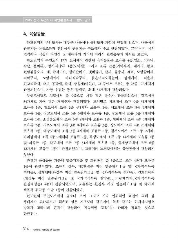2015 전국 무인도서 자연환경조사 완도 권역 314 ? National Institute of Ecology 4. 육상동물 완도권역의 무인도서는 대부분 내륙이나 유인도와 가깝게 인접해 있으며, 내륙에서 관찰되는 산림조류와 연안에서 관찰되는 수조류가 주로 관찰되었다. 그러나 각 섬의 면적이나 식생의 다양성 및 내륙과의 거리에 따라서 관찰종수의 차이를 보였다. 완도권역의 무인도서 17개 도서에서 관찰된 육지동물은 포유류 4종 염소, 고라니, 수달, 설치류 , 양서?파충류 1종 도마뱀 그리고 조류 23종 가마우지, 왜가리, 황로, 흰뺨검둥오리, 매, 깝작도요, 괭이갈매기, 멧비둘기, 칼새, 물총새, 제비, 노랑할미새, 직박구리, 노랑때까치, 바다직박구리, 붉은머리오목눈이, 섬개개비, 되솔새, 긴꼬리딱새, 박새,...