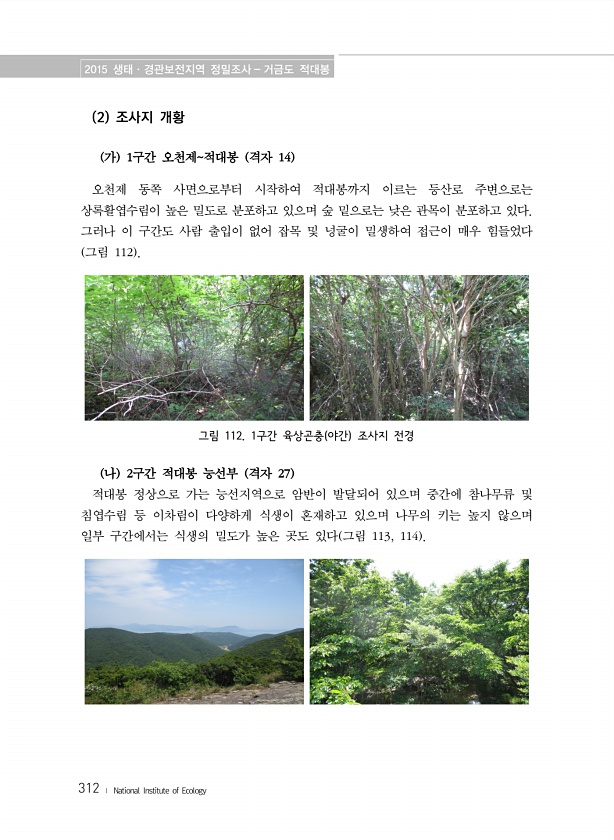 2015 생태·경관보전지역 정밀조사 거금도 적대봉 312 ? National Institute of Ecology 2 조사지 개황 가 1구간 오천제적대봉 격자 14 오천제 동쪽 사면으로부터 시작하여 적대봉까지 이르는 등산로 주변으로는 상록활엽수림이 높은 밀도로 분포하고 있으며 숲 밑으로는 낮은 관목이 분포하고 있다. 그러나 이 구간도 사람 출입이 없어 잡목 및 넝굴이 밀생하여 접근이 매우 힘들었다 그림 112 그림 112. 1구간 육상곤충 야간 조사지 전경 나 2구간 적대봉 능선부 격자 27 적대봉 정상으로 가는 능선지역으로 암반이 발달되어 있으며 중간에 참나무류 및 침엽수림 등 이차림이 다양하게 식생이 혼재하고 있으며 나무의 키는 높지 않으며 일부 구간에서는 식생의 밀도가 높은 곳도 있다 그림 113, 1...
