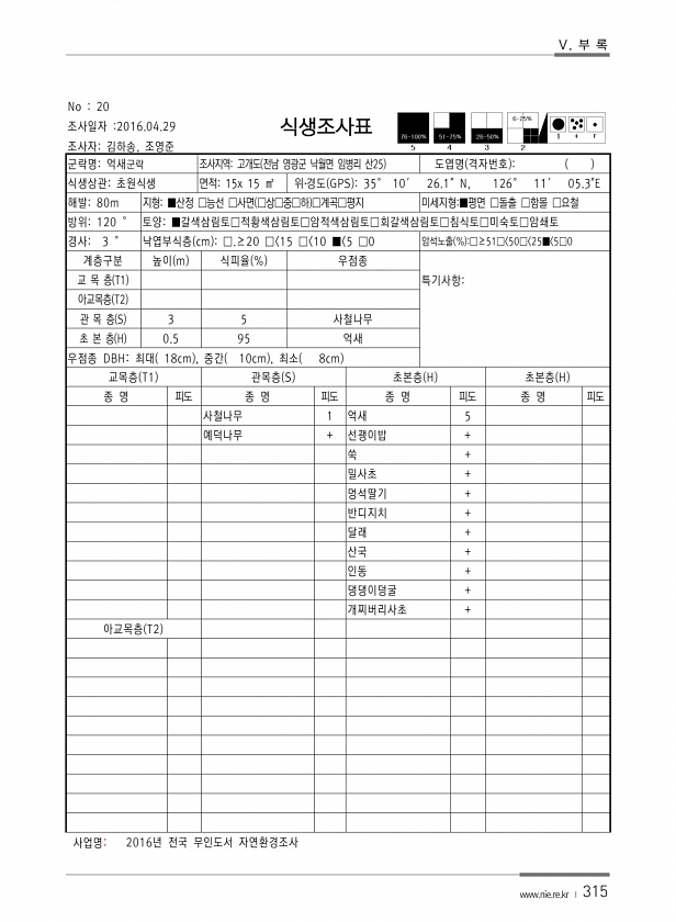 Ⅴ. 부 록 www.nie.re.kr ? 315 No 20 조사일자 2016.04.29 조사자김하송, 조영준 식생조사표 군락명억새군락 조사지역고개도 전남 영광군 낙월면 임병리 산25 도엽명 격자번호 식생상관초원식생 면적15x 15 ㎡ 위?경도 GPS 35° 10′ 26.1″N, 126° 11′ 05.3E 해발80m 지형■산정 □능선 □사면 □상□중□하 □계곡□평지 미세지형■평면 □돌출 □함몰 □요철 방위120 ° 토양■갈색삼림토□적황색삼림토□암적색삼림토□회갈색삼림토□침식토□미숙토□암쇄토 경사3 ° 낙엽부식층 cm □.≥20 □ 15 □ 10 ■ 5 □0 암석노출 % □≥51□ 50□ 25■ 5□0 계층구분 높이 m 식피율 % 우점종 교 목 층 T1 특기사항아교목층 T2 관 목 층 S 3 5 사철나무 초 본 ...