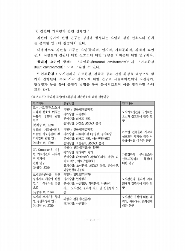 293 연구제목 연구방법 연구내용 도시가로경관요소가 시각적 선호에 미치는 복합적 영향에 관한 연구 변재상 외, 1999 피험자전문가 전공학생 평가방법사진평가 분석방법리커트 척도 통계방법t-검증, ANOVA 분석 도시가로경관을 구성하는 요소와 선호도에 관한 연 구 컴퓨터 시뮬레이션을 이용한 가로경관의 평 가기법에 관한 연구 오덕성 외, 1999 피험자전문가 전공학생 평가방법시뮬레이션 동영상, 정지화상 분석방법리커트 척도, 어의구별척 SD 통계방법요인분석, ANOVA 분석 가로변 건축물과 시각적 선호도의 평가를 위한 시 뮬레이션을 이용한 연구 CG Simulation을 이용 한 가로경관의 시지각 적 평가에 관한 연구 최임주, 2003 피험자전문가 전공자 , 일반인 평가방법슬라이드 평가 분석방법Cronbachs ...