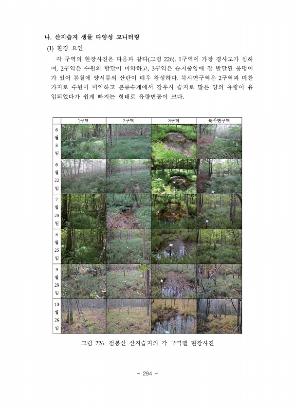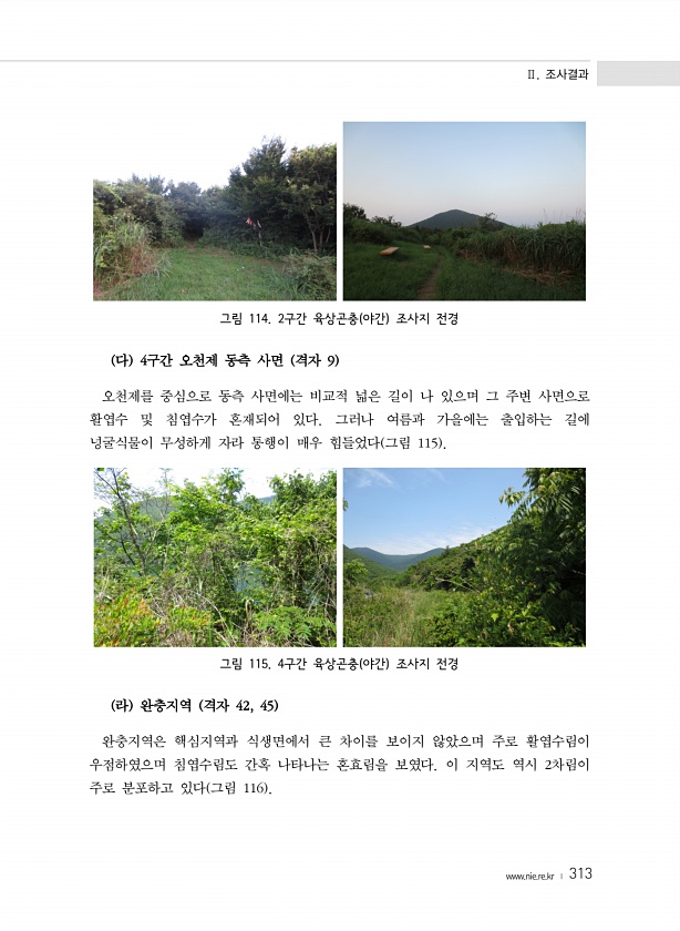 Ⅱ. 조사결과 www.nie.re.kr ? 313 그림 114. 2구간 육상곤충 야간 조사지 전경 다 4구간 오천제 동측 사면 격자 9 오천제를 중심으로 동측 사면에는 비교적 넓은 길이 나 있으며 그 주변 사면으로 활엽수 및 침엽수가 혼재되어 있다. 그러나 여름과 가을에는 출입하는 길에 넝굴식물이 무성하게 자라 통행이 매우 힘들었다 그림 115 그림 115. 4구간 육상곤충 야간 조사지 전경 라 완충지역 격자 42, 45 완충지역은 핵심지역과 식생면에서 큰 차이를 보이지 않았으며 주로 활엽수림이 우점하였으며 침엽수림도 간혹 나타나는 혼효림을 보였다. 이 지역도 역시 2차림이 주로 분포하고 있다 그림 116