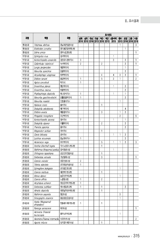 Ⅱ. 조사결과 www.nie.re.kr ? 315 과명 학명 국명 조사년도 성재 2018 성재 2013 대성 2018 대성 2013 적근 2018 적근 2013 산양+주파 2013 흰바 2013 도창 2018 고둔 2018 비운 2018 명나방과 Teliphasa albifusa 흰날개큰집명나방 1 3 명나방과 Etielloides curvellus 흰띠붉은알락명나방 1 명나방과 Salma amica 흰무늬집명나방 1 박각시과 Sphingulus mus 갈색박각시 1 박각시과 Kentrochrysalis consimilis 검정무늬점박각시 3 3 3 1 박각시과 Callambulyx tatarinovii 녹색박각시 2 2 2 1 박각시과 Langia zenzeroides 대왕박각시 1 박각시과 Marumba...