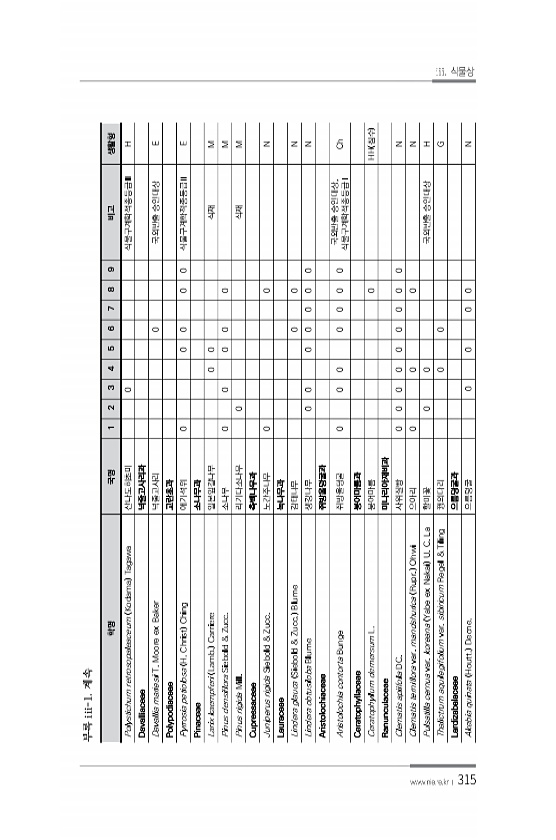 315 학명 국명 1 2 3 4 5 6 7 8 9 비고 생활형 Polystichum retrosopaleaceum Kodama Tagawa 산나도히초미 0 식물구계학적종등급Ⅲ H Davalliaceae 넉줄고사리과 Davallia mariesii T. Moore ex Baker 넉줄고사리 0 국외반출 승인대상 E Polypodiaceae 고란초과 Pyrrosia petiolosa H. Christ Ching 애기석위 0 0 0 0 0 식물구계학적종등급Ⅱ E Pinaceae 소나무과 Larix kaempferi Lamb. Carriere 일본잎갈나무 0 0 식재 M Pinus densiflora Siebold & Zucc. 소나무 0 0 0 0 0 M Pinus rigida Mill. 리기다소나무 0 식재 M...