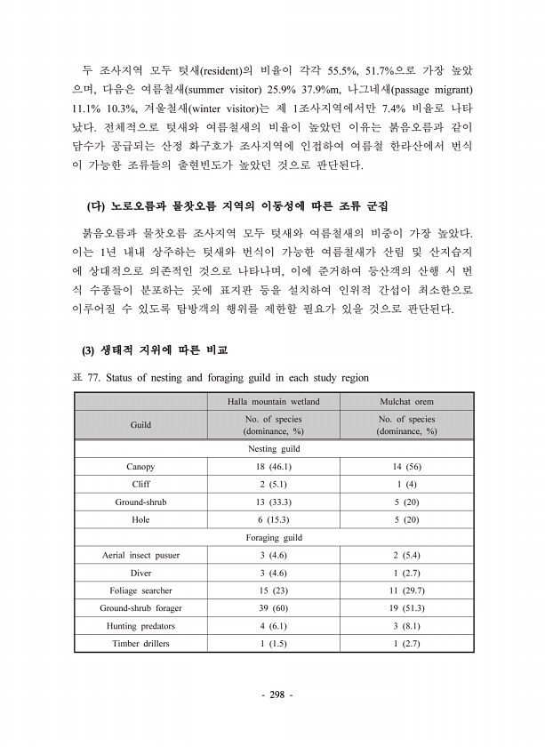 298 resident 55.5%, 51.7% , summer visitor 25.9% 37.9%m, passage migrant 11.1% 10.3%, winter visitor 1 7.4% 1 , 3 77. Status of nesting and foraging guild in each study region Halla mountain wetland Mulchat orem Guild No. of species dominance, % No. of species dominance, % Nesting guild Canopy 18 46.1 14 56 Cliff 2 5.1 1 4 Ground-shrub 13 33.3 5 20 Hole 6 15.3 5 20 Foraging guild Aerial insect pus...