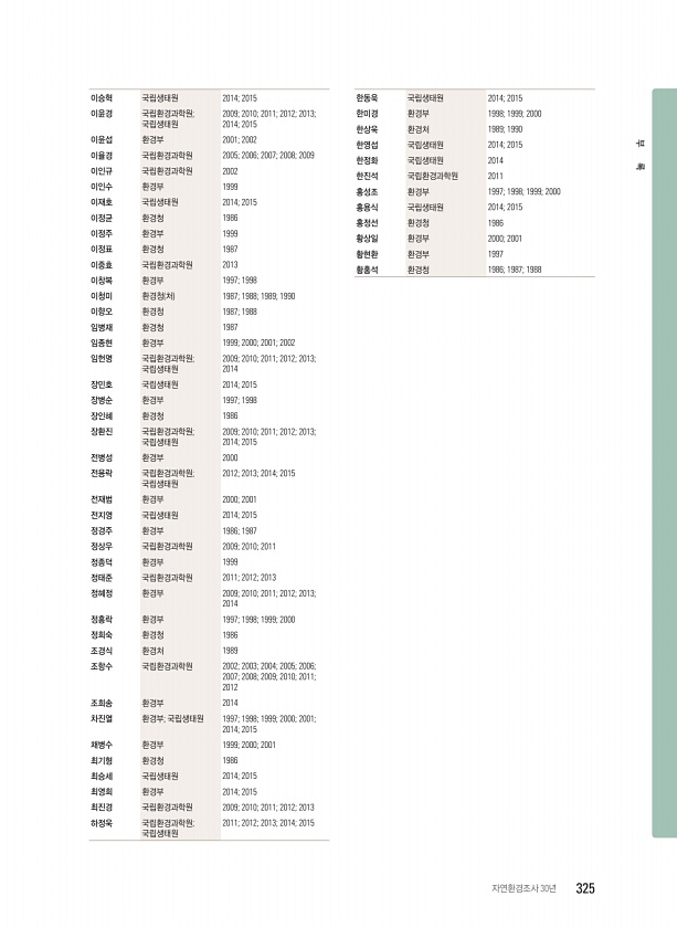 이승혁 국립생태원 2014; 2015 이윤경 국립환경과학원; 국립생태원 2009; 2010; 2011; 2012; 2013; 2014; 2015 이윤섭 환경부 2001; 2002 이율경 국립환경과학원 2005; 2006; 2007; 2008; 2009 이인규 국립환경과학원 2002 이인수 환경부 1999 이재호 국립생태원 2014; 2015 이정균 환경청 1986 이정주 환경부 1999 이정표 환경청 1987 이중효 국립환경과학원 2013 이창복 환경부 1997; 1998 이청미 환경청 처 1987; 1988; 1989; 1990 이향오 환경청 1987; 1988 임병재 환경청 1987 임종현 환경부 1999; 2000; 2001; 2002 임헌명 국립환경과학원; 국립생태원 2009; 2010; 2011; ...