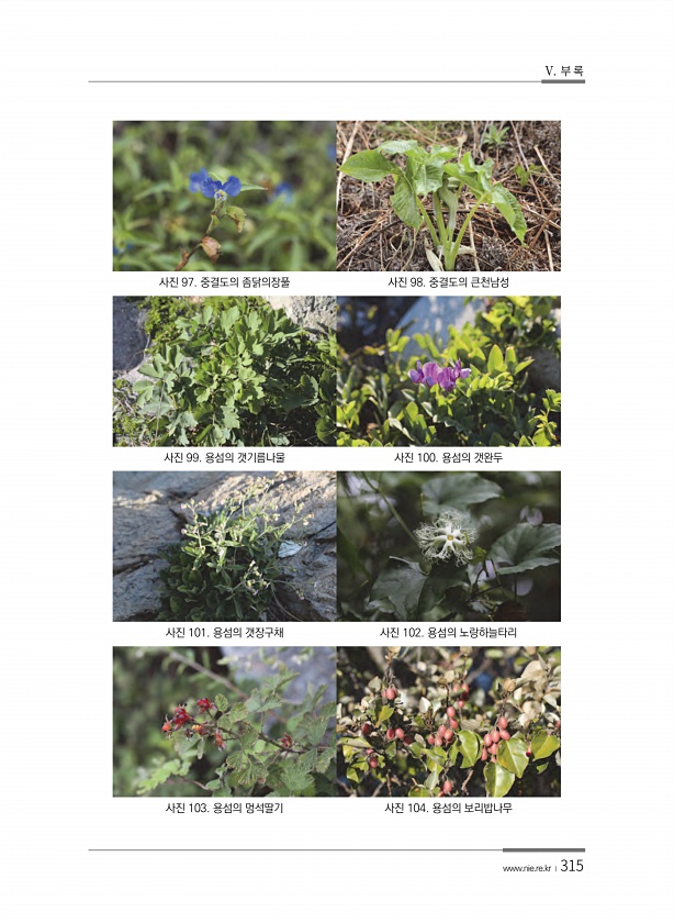 V. 부 록 www.nie.re.kr ?315 사진 97. 중결도의 좀닭의장풀 사진 98. 중결도의 큰천남성 사진 99. 용섬의 갯기름나물 사진 100. 용섬의 갯완두 사진 101. 용섬의 갯장구채 사진 102. 용섬의 노랑하늘타리 사진 103. 용섬의 멍석딸기 사진 104. 용섬의보리밥나무