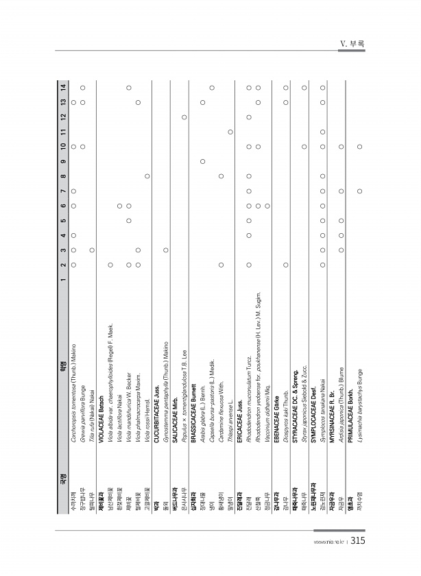 315 국명 학명 1 2 3 4 5 6 7 8 9 10 11 12 13 14 수까치깨 Corchoropsis tomentosa Thunb. Makino ○ ○ ○ ○ ○ ○ ○ 장구밥나무 Grewia parviflora Bunge ○ ○ ○ 털피나무 Tilia rufa Nakai Nakai ○ 제비꽃과 VIOLACEAE Batsch 남산제비꽃 Viola albida var. chaerophylloides Regel F. Maek. ○ 흰젖제비꽃 Viola lactiflora Nakai ○ 제비꽃 Viola mandshurica W. Becker ○ ○ ○ ○ 털제비꽃 Viola phalmacrocarpa Maxim. ○ ○ ○ 고깔제비꽃 Viola rossii Hemsl. ○ 박과 CUCURBITACEAE ...
