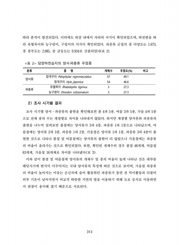 313 따라 흔적이 발견되었다. 이외에도 하천 내에서 자라의 서식이 확인되었으며, 하천변을 따 라 유혈목이와 능구렁이, 구렁이의 서식이 확인되었다. 파충류 군집의 종 다양도는 1.673, 종 풍부도는 2.085, 종 균등도는 0.934로 산출되었다 표 2 분류 종 명 개체수 우점도 % 비고 양서류 참개구리 Pelophylax nigromaculatus 57 49.1 청개구리 Hyla japonica 54 46.6 파충류 유혈목이 Rhabdophis tigrinus 3 27.3 능구렁이 Dinodon rufozonatum 3 27.3 표 2 담양하천습지의 양서·파충류 우점종 2 조사 시기별 결과 조사 시기별 양서·파충류의 출현을 확인해보면 봄 4과 5종, 여름 3과 5종, 가을 4과 5종 으로 전체 종의 수는...