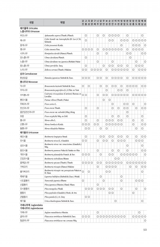 321 쐐기풀목 Urticales 느릅나무과 Ulmaceae 푸조나무 Aphananthe aspera Thunb. Planch. ○ ○ ○ ○ ○ ○ ○ ○ ○ 폭나무 Celtis biondii var. heterophylla H. Lev. C.K. Schneid. ○ ○ ○ ○ ○ ○ ○ ○ ○ ○ ○ 풍게나무 Celtis jessoensis Koidz. ○ ○ ○ ○ ○ 팽나무 Celtis sinensis Pers. ○ ○ ○ ○ ○ ○ ○ ○ ○ ○ ○ ○ ○ ○ ○ ○ ○ 시무나무 Hemiptelea davidii Hance Planch. ○ ○ ○ ○ ○ ○ 당느릅나무 Ulmus davidiana Planch. ○ ○ 느릅나무 Ulmus davidiana var. japonica Rehder Nak...