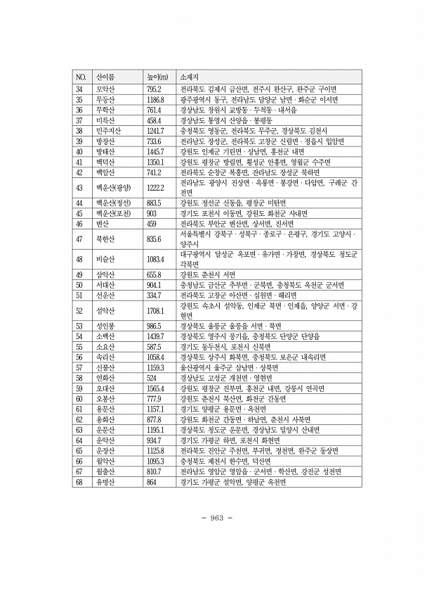 963 NO. 산이름 높이 m 소재지 34 모악산 795.2 전라북도 김제시 금산면, 전주시 완산구, 완주군 구이면 35 무등산 1186.8 광주광역시 동구, 전라남도 담양군 남면ㆍ화순군 이서면 36 무학산 761.4 경상남도 창원시 교방동ㆍ두척동ㆍ내서읍 37 미륵산 458.4 경상남도 통영시 산양읍ㆍ봉평동 38 민주지산 1241.7 충청북도 영동군, 전라북도 무주군, 경상북도 김천시 39 방장산 733.6 전라남도 장성군, 전라북도 고창군 신림면ㆍ정읍시 입암면 40 방태산 1445.7 강원도 인제군 기린면ㆍ상남면, 홍천군 내면 41 백덕산 1350.1 강원도 평창군 방림면, 횡성군 안흥면, 영월군 수주면 42 백암산 741.2 전라북도 순창군 복흥면, 잔라남도 장성군 북하면 43 백운산 광양 1222.2 ...