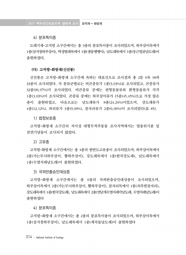 2017 백두대간보호지역 생태계 조사 묘적재 화방재 314 ? National Institute of Ecology 4 분포특이종 도래기재고직령 소구간에서는 총 3종의 분포특이종이 조사되었으며, 하루살이목에서 1종 삼지창하루살이 , 딱정벌레목에서 1종 샘물땡땡이 , 날도래목에서 1종 둥근얼굴날도래 이 출현하였다. 다 고직령화방재 신선봉 신선봉은 고직령화방재 소구간에 속하는 대표산으로 조사결과 총 2문 6목 18과 33종이 조사되었다. 각 분류군별로는 비곤충류가 1종 3.03% 로 조사되었고, 곤충류가 32종 96.97% 가 조사되었다. 비곤충류 중에는 편형동물류와 환형동물류가 각각 1종 3.03% 이 조사되었다. 곤충류 중에는 하루살이류가 15종 45.45% 으로 가장 많은 종이 출현하였고, 다음으로는 날도...