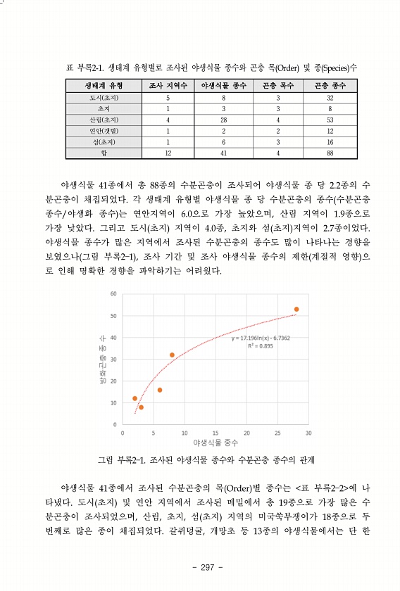 297 생태계 유형 조사 지역수 야생식물 종수 곤충 목수 곤충 종수 도시 초지 5 8 3 32 초지 1 3 3 8 산림 초지 4 28 4 53 연안 갯벌 1 2 2 12 섬 초지 1 6 3 16 합 12 41 4 88 표 부록2-1. 생태계 유형별로 조사된 야생식물 종수와 곤충 목 Order 및 종 Species 수 야생식물 41종에서 총 88종의 수분곤충이 조사되어 야생식물 종 당 2.2종의 수 분곤충이 채집되었다. 각 생태계 유형별 야생식물 종 당 수분곤충의 종수 수분곤충 종수/야생화 종수 는 연안지역이 6.0으로 가장 높았으며, 산림 지역이 1.9종으로 가장 낮았다. 그리고 도시 초지 지역이 4.0종, 초지와 섬 초지 지역이 2.7종이었다. 야생식물 종수가 많은 지역에서 조사된 수분곤충의 종수도 많이 ...