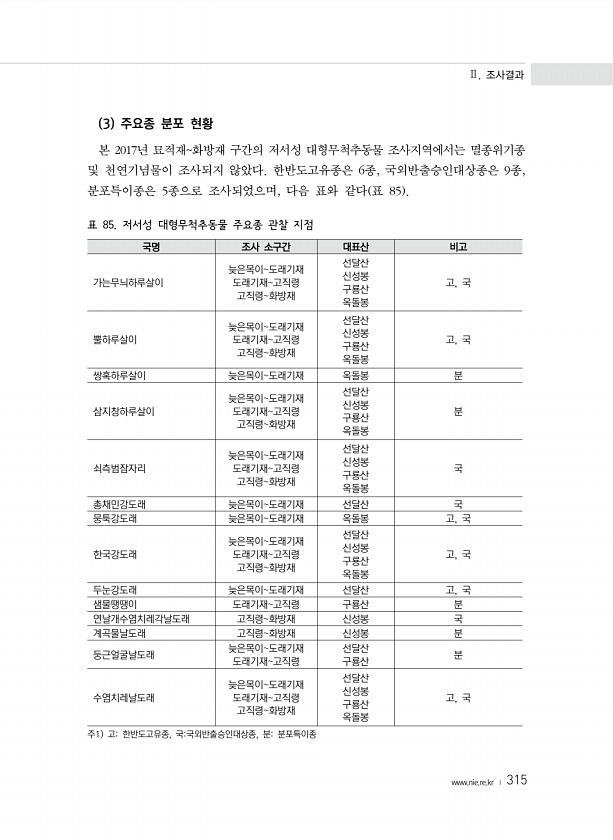 Ⅱ. 조사결과 www.nie.re.kr ? 315 3 주요종 분포 현황 본 2017년 묘적재화방재 구간의 저서성 대형무척추동물 조사지역에서는 멸종위기종 및 천연기념물이 조사되지 않았다. 한반도고유종은 6종, 국외반출승인대상종은 9종, 분포특이종은 5종으로 조사되었으며, 다음 표와 같다 표 85 국명 조사 소구간 대표산 비고 가는무늬하루살이 늦은목이도래기재 도래기재고직령 고직령화방재 선달산 신성봉 구룡산 옥돌봉 고, 국 뿔하루살이 늦은목이도래기재 도래기재고직령 고직령화방재 선달산 신성봉 구룡산 옥돌봉 고, 국 쌍혹하루살이 늦은목이도래기재 옥돌봉 분 삼지창하루살이 늦은목이도래기재 도래기재고직령 고직령화방재 선달산 신성봉 구룡산 옥돌봉 분 쇠측범잠자리 늦은목이도래기재 도래기재고직령 고직령화방재 선달산 신성봉 구룡...
