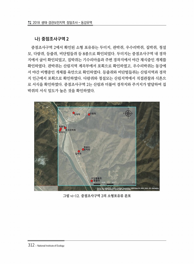 2018 생태·경관보전지역 정밀조사 동강유역 312 ? National Institute of Ecology 2 중점조사구역 2에서 확인된 소형 포유류는 두더지, 관박쥐, 우수리박쥐, 집박쥐, 청설 모, 다람쥐, 등줄쥐, 비단털들쥐 등 8종으로 확인되었다. 두더지는 중점조사구역 내 경작 지에서 굴이 확인되었고, 집박쥐는 기수리마을과 주변 경작지에서 야간 채식중인 개체를 확인하였다. 관박쥐는 산림지역 계곡부에서 포획으로 확인하였고, 우수리박쥐는 동강에 서 야간 비행중인 개체를 육안으로 확인하였다. 등줄쥐와 비단털들쥐는 산림지역과 경작 지 인근에서 포획으로 확인하였다. 다람쥐와 청설모는 산림지역에서 직접관찰과 식흔으 로 서식을 확인하였다. 중점조사구역 2는 산림과 더불어 경작지와 주거지가 발달하여 집 박쥐의 서...