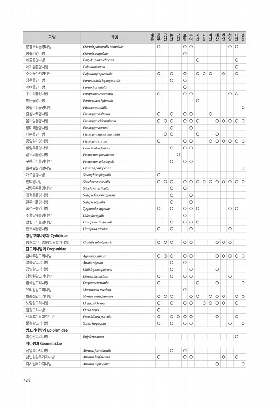 324 분홍무늬들명나방 Ostrinia palustralis memnialis ○ ○ ○ ○ ○ 콩줄기명나방 Ostrinia scapulalis ○ 네줄들명나방 Pagyda quinquelineata ○ ○ 애기흰들명나방 Palpita inusitata ○ 수수꽃다리명나방 Palpita nigropunctalis ○ ○ ○ ○ ○ ○ ○ ○ 담흑들명나방 Paranacoleia lophophoralis ○ ○ 애벼물명나방 Parapotnx vittalis ○ 우수리물명나방 Parapoynx ussuriensis ○ ○ ○ ○ ○ 흰눈물명나방 Parthenodes bifurcalis ○ 콩팥무늬들명나방 Piletocera sodalis ○ 갈참나무명나방 Pleuroptya balteaya ○ ○ ○ ○ ○ 몸노...