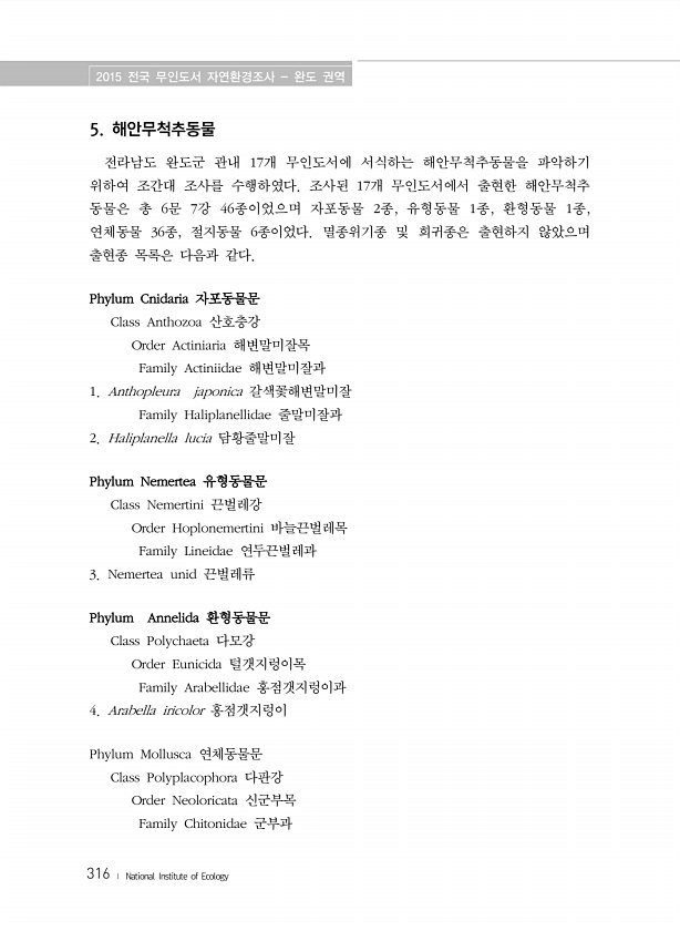 2015 전국 무인도서 자연환경조사 완도 권역 316 ? National Institute of Ecology 5. 해안무척추동물 전라남도 완도군 관내 17개 무인도서에 서식하는 해안무척추동물을 파악하기 위하여 조간대 조사를 수행하였다. 조사된 17개 무인도서에서 출현한 해안무척추 동물은 총 6문 7강 46종이었으며 자포동물 2종, 유형동물 1종, 환형동물 1종, 연체동물 36종, 절지동물 6종이었다. 멸종위기종 및 희귀종은 출현하지 않았으며 출현종 목록은 다음과 같다. Phylum Cnidaria 자포동물문 Class Anthozoa 산호충강 Order Actiniaria 해변말미잘목 Family Actiniidae 해변말미잘과 1. Anthopleura japonica 갈색꽃해변말미잘 Family Hal...