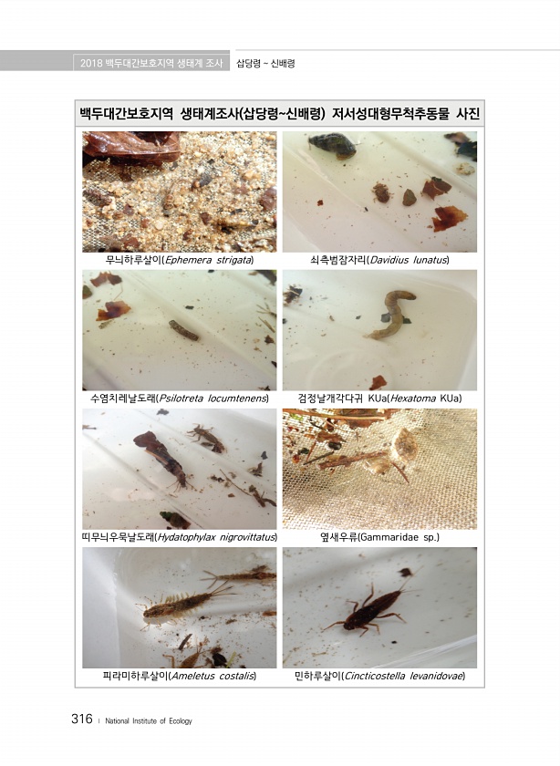 2018 백두대간보호지역 생태계 조사 삽당령 신배령 316 ? National Institute of Ecology 백두대간보호지역 생태계조사 삽당령신배령 저서성대형무척추동물 사진 무늬하루살이 Ephemera strigata 쇠측범잠자리 Davidius lunatus 수염치레날도래 Psilotreta locumtenens 검정날개각다귀 KUa Hexatoma KUa 띠무늬우묵날도래 Hydatophylax nigrovittatus 옆새우류 Gammaridae sp. 피라미하루살이 Ameletus costalis 민하루살이 Cincticostella levanidovae