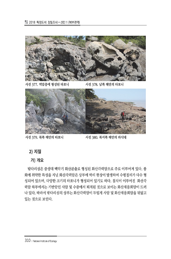 2018 특정도서 정밀조사 신안 1 북부권역 310 ? National Institute of Ecology 2 밖다리섬은 중생대 백악기 화산분출로 형성된 화산각력암으로 주로 이루어져 있다. 풍 화에 취약한 특성을 지닌 화산각력암은 상부에 박리 현상이 발생하여 수평절리가 다수 형 성되어 있으며, 다양한 크기의 타포니가 형성되어 있기도 하다. 침식이 이루어진 화산각 력암 하부에서는 기반암인 사암 및 수중에서 퇴적된 것으로 보이는 화산재응회암이 드러 나 있다. 따라서 밖다리섬의 상부는 화산각력암이 두텁게 사암 및 화산재응회암을 뒤덮고 있는 것으로 보인다. 사진 377. 역암층에 형성된 타포니 사진 378. 남쪽 해안의 타포니 사진 379. 북쪽 해안의 타포니 사진 380. 북서쪽 해안의파식대