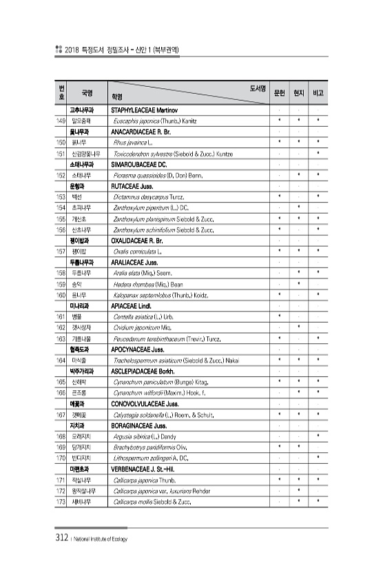 2018 특정도서 정밀조사 신안 1 북부권역 312 ? National Institute of Ecology 번 호 국명 도서명 학명 문헌 현지 비고 고추나무과 STAPHYLEACEAE Martinov 149 말오줌때 Euscaphis japonica Thunb. Kanitz * * * 옻나무과 ANACARDIACEAE R. Br. 150 붉나무 Rhus javainca L. * * * 151 산검양옻나무 Toxicodendron sylvestre Siebold & Zucc. Kuntze * 소태나무과 SIMAROUBACEAE DC. 152 소태나무 Picrasma quassioides D. Don Benn. * * 운향과 RUTACEAE Juss. 153 백선 Dictamnus dasycarpu...
