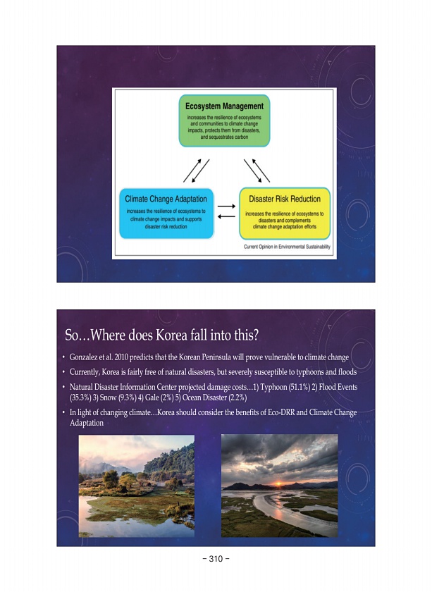So…Where does Korea fall into this? ? Gonzalez et al. 2010 predicts that the Korean Peninsula will prove vulnerable to climate change ? Currently, Korea is fairly free of natural disasters, but severely susceptible to typhoons and floods ? Natural Disaster Information Center projected damage costs…1 Typhoon 51.1% 2 Flood Events 35.3% 3 Snow 9.3% 4 Gale 2% 5 Ocean Disaster 2.2% ? In light of changi...