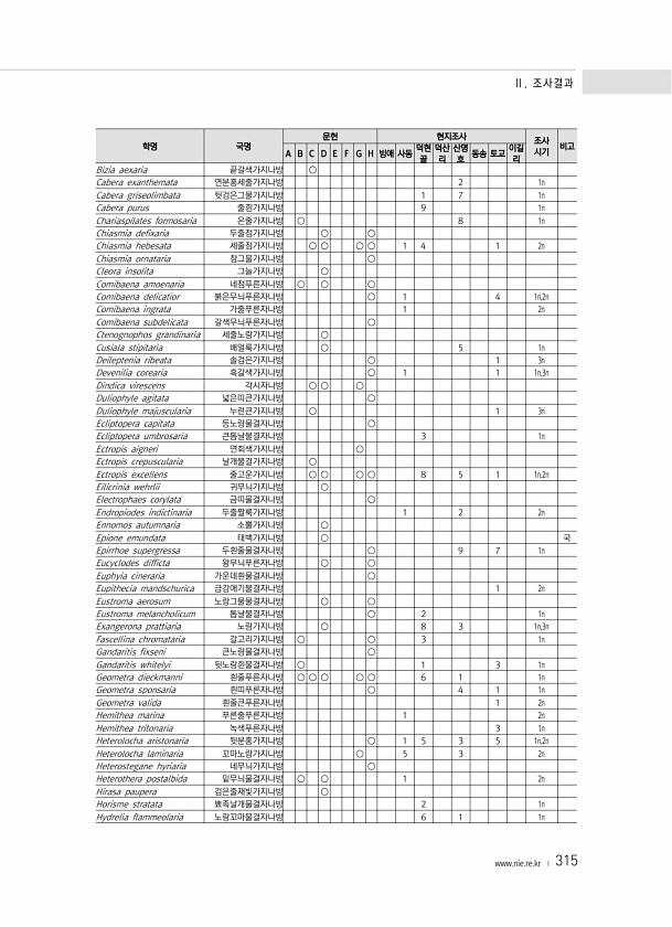 Ⅱ. 조사결과 www.nie.re.kr ? 315 학명 국명 문헌 현지조사 조사 A B C D E F G H 빙애 사동 덕현 시기 비고 골 덕산 리 산명 호 동송 토교 이길 리 Bizia aexaria 끝갈색가지나방 ○ Cabera exanthemata 연분홍세줄가지나방 2 1n Cabera griseolimbata 뒷검은그물가지나방 1 7 1n Cabera purus 줄흰가지나방 9 1n Chariaspilates formosaria 은줄가지나방 ○ 8 1n Chiasmia defixaria 두줄점가지나방 ○ ○ Chiasmia hebesata 세줄점가지나방 ○ ○ ○ ○ 1 4 1 2n Chiasmia ornataria 참그물가지나방 ○ Cleora insolita 그늘가지나방 ○ Comibaena am...