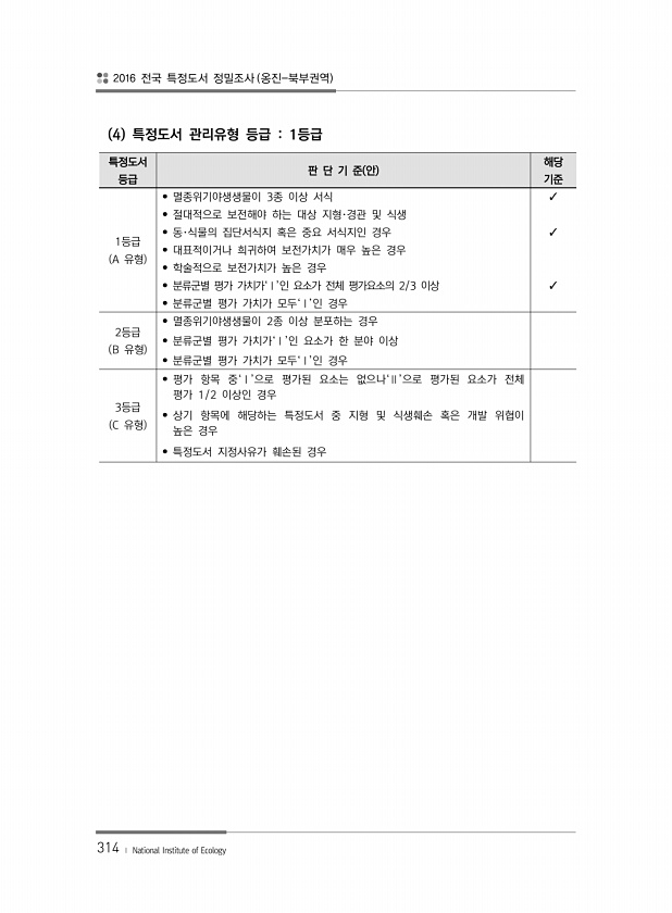 2016 전국 특정도서 정밀조사 옹진-북부권역 314 ? National Institute of Ecology 4 특정도서 관리유형 등급 1등급 특정도서 등급 판 단 기 준 안 해당 기준 1등급 A 유형 ? 멸종위기야생생물이 3종 이상 서식 ? ? 절대적으로 보전해야 하는 대상 지형·경관 및 식생 ? 동·식물의 집단서식지 혹은 중요 서식지인 경우 ? ? 대표적이거나 희귀하여 보전가치가 매우 높은 경우 ? 학술적으로 보전가치가 높은 경우 ? 분류군별 평가 가치가‘Ⅰ’인 요소가 전체 평가요소의 2/3 이상 ? ? 분류군별 평가 가치가 모두‘Ⅰ’인 경우 2등급 B 유형 ? 멸종위기야생생물이 2종 이상 분포하는 경우 ? 분류군별 평가 가치가‘Ⅰ’인 요소가 한 분야 이상 ? 분류군별 평가 가치가 모두‘Ⅰ’인 경우 3...