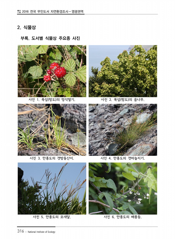 2016 전국 무인도서 자연환경조사 영광권역 316 ? National Institute of Ecology 2. 식물상 부록. 도서별 식물상 주요종 사진 사진 1. 목섬 항도 의 멍석딸기. 사진 2. 목섬 항도 의 음나무. 사진 3. 만풍도의 갯방동산이. 사진 4. 만풍도의 갯하늘지기. 사진 5. 만풍도의 모새달. 사진 6. 만풍도의배풍등.