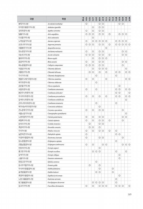 325 뾰족가지나방 Acrodontis kotshubeji ○ ○ ○ ○ ○ 아지랑이물결가지나방 Aethalura ignobilis ○ ○ ○ 검띠푸른자나방 Agathia carissima ○ ○ ○ ○ 털뿔가지나방 Alcis angulifera ○ ○ ○ ○ ○ ○ ○ ○ ○ 다섯줄가지나방 Alcis extinctaria ○ 노박덩굴가지나방 Amraica superans ○ ○ ○ ○ ○ ○ ○ ○ ○ ○ 오얏나무가지나방 Angerona prunaria ○ ○ ○ ○ ○ ○ ○ ○ ○ ○ ○ 네줄붉은가지나방 Apopetelia morosa ○ 뒷노랑점가지나방 Arichanna melanaria ○ ○ ○ ○ ○ ○ 네눈쑥가지나방 Ascotis selenaria ○ ○ ○ ○ ○ ○ ○ ○ 불회색가지나방 B...