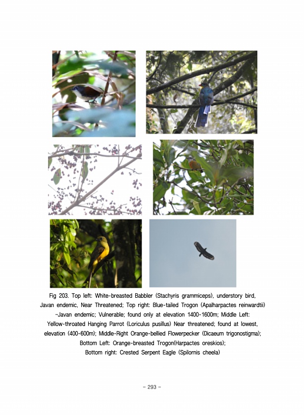 Fig 203. Top leftWhite-breasted Babbler Stachyris grammiceps , understory bird, Javan endemic, Near Threatened; Top rightBlue-tailed Trogon Apalharpactes reinwardtii ?Javan endemic; Vulnerable; found only at elevation 1400-1600m; Middle LeftYellow-throated Hanging Parrot Loriculus pusillus Near threatened; found at lowest, elevation 400-600m ; Middle-Right Orange-bellied Flowerpecker Dicaeum trigo...