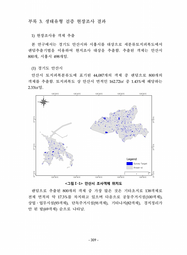 부록 3. 생태유형 검증 현장조사 결과 1 현장조사용 객체 추출 본 연구에서는 경기도 안산시와 시흥시를 대상으로 세분류토지피복도에서 랜덤추출기법을 이용하여 현지조사 대상을 추출함. 추출된 객체는 안산시 800개, 시흥시 498개임. 1 경기도 안산시 안산시 토지피복분류도에 표기된 44,087개의 객체 중 랜덤으로 800개의 객체를 추출함. 토지피복도 상 안산시 면적인 162.72㎢ 중 1.43%에 해당하는 2.33㎢임. 그림Ⅰ-1 안산시 조사객체 위치도 랜덤으로 추출된 800개의 객체 중 가장 많은 것은 기타초지로 138객체로 전체 면적의 약 17.3%를 차지하고 있으며 다음으로 공동주거시설 100객체 , 상업?업무시설 93객체 , 단독주거시설 91객체 , 기타나지 82객체 , 경지정리가 안 된 밭 69객체...