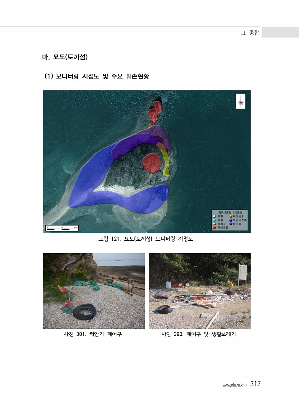 Ⅲ. 종합 www.nie.re.kr ? 317 마. 묘도 토끼섬 1 모니터링 지점도 및 주요 훼손현황 그림 121. 묘도 토끼섬 모니터링 지점도 사진 381. 해안가 폐어구 사진 382. 폐어구 및생활쓰레기