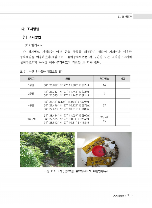 Ⅱ. 조사결과 www.nie.re.kr ? 315 다. 조사방법 1 조사방법 가 현지조사 각 격자별로 서식하는 야간 곤충 종류를 채집하기 위하여 자외선을 이용한 등화채집을 이용하였다 그림 117 유아등화트랩은 각 구간별 또는 격자별 1-2개씩 설치하였으며 24시간 이후 수거하였고 좌표는 표 71과 같다. 조사지 좌표 격자번호 비고 1구간 34°26.857′N,127°11.586′E 87m 14 2구간 34°26.747′N,127°11.751′E 92m 34°26.383′N,127°11.945′E 71m 9 4구간 34°28.18′N,127°11.023′E 429m 34°27.496′N,127°10.129′E 376m 34°27.473′N,127°10.315′E 488m 27 완충구역 34°28.424′N,1...
