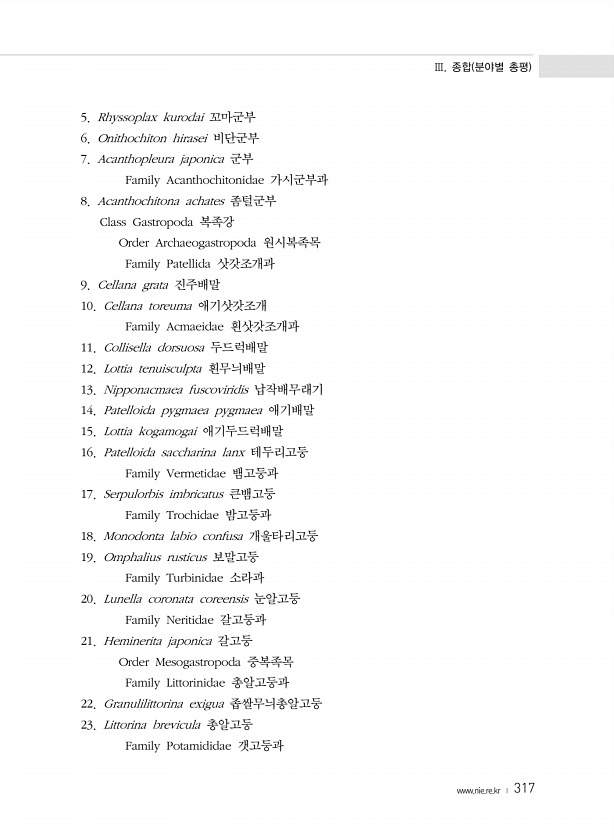 Ⅲ. 종합 분야별 총평 www.nie.re.kr ? 317 5. Rhyssoplax kurodai 꼬마군부 6. Onithochiton hirasei 비단군부 7. Acanthopleura japonica 군부 Family Acanthochitonidae 가시군부과 8. Acanthochitona achates 좀털군부 Class Gastropoda 복족강 Order Archaeogastropoda 원시복족목 Family Patellida 삿갓조개과 9. Cellana grata 진주배말 10. Cellana toreuma 애기삿갓조개 Family Acmaeidae 흰삿갓조개과 11. Collisella dorsuosa 두드럭배말 12. Lottia tenuisculpta 흰무늬배말 13. Nipponacm...