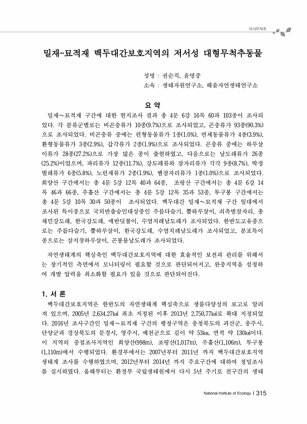 제목 : (2016) 백두대간보호지역 생태계 조사.밀재~묘적재