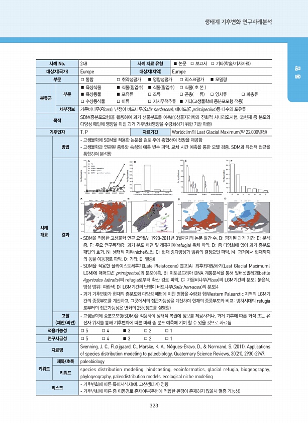 323 생태계 기후변화 연구사례분석 통 합 사례 No. 248 사례 자료 유형 ■ 논문 □ 보고서 □ 기타 학술/기사자료 대상지 국가 Europe 대상지 지역 Europe 부문 □ 통합 □ 취약성평가 ■ 영향성평가 □ 리스크평가 ■ 모델링 분류군 부문 ■ 육상식물 ■ 식물 침엽수 ■ 식물 활엽수 □ 식물 초 본 ■ 육상동물 ■ 포유류 □ 조류 □ 곤충 류 □ 양서류 □ 파충류 □ 수상동식물 □ 어류 □ 저서무척추류 ■ 기타 고생물학에 종분포모형 적용 세부정보 가문비나무 Picea , 난쟁이 버드나무 Salix herbacea , 매머드 E. primigenius 등 다수의 포유류 목적 SDM 종분포모형 을 활용하여 과거 생물분포를 예측 ①생물지리학과 진화적 시나리오시험, ②현재 종 분포와 다양성 패턴에 영향...
