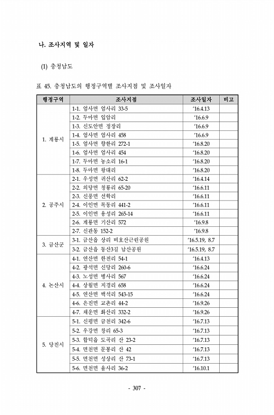 307 행정구역 조사지점 조사일자 비고 1. 계룡시 1-1. 엄사면 엄사리 33-5 ‘16.4.13 1-2. 두마면 입암리 ‘16.6.9 1-3. 신도안면 정장리 ‘16.6.9 1-4. 엄사면 엄사리 458 ‘16.6.9 1-5. 엄사면 향한리 272-1 ‘16.8.20 1-6. 엄사면 엄사리 454 ‘16.8.20 1-7. 두마면 농소리 16-1 ‘16.8.20 1-8. 두마면 왕대리 ‘16.8.20 2. 공주시 2-1. 우성면 귀산리 62-2 ‘16.4.14 2-2. 의당면 청룡리 65-20 ‘16.6.11 2-3. 신풍면 선학리 ‘16.6.11 2-4. 이인면 목동리 441-2 ‘16.6.11 2-5. 이인면 용성리 265-14 ‘16.6.11 2-6. 계룡면 기산리 572 ‘16.9.8 2-7. 신관...