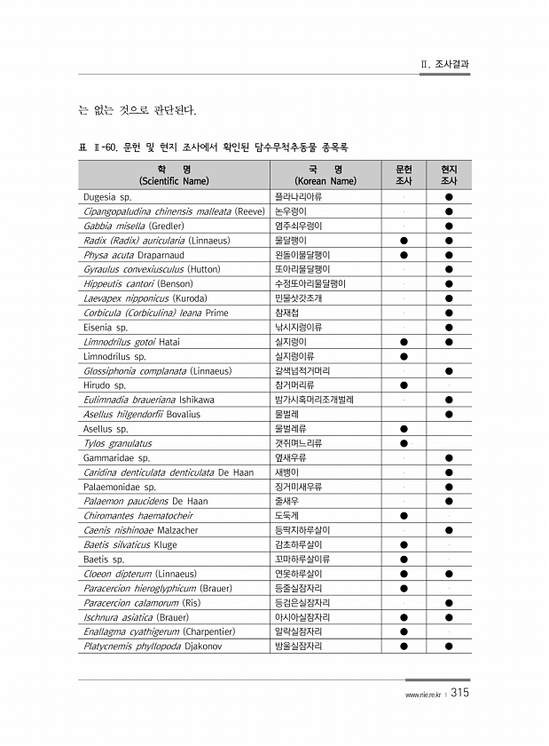 Ⅱ. 조사결과 www.nie.re.kr ? 315 학 명 Scientific Name 국 명 Korean Name 문헌 조사 현지 조사 Dugesia sp. 플라나리아류 ● Cipangopaludina chinensis malleata Reeve 논우렁이 ● Gabbia misella Gredler 염주쇠우렁이 ● Radix Radix auricularia Linnaeus 물달팽이 ● ● Physa acuta Draparnaud 왼돌이물달팽이 ● ● Gyraulus convexiusculus Hutton 또아리물달팽이 ● Hippeutis cantori Benson 수정또아리물달팽이 ● Laevapex nipponicus Kuroda 민물삿갓조개 ● Corbicula Corbiculin...
