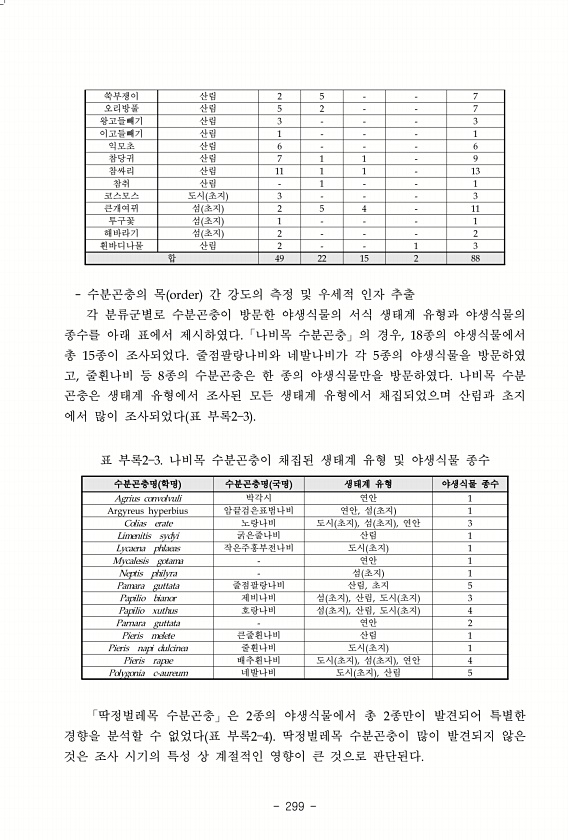 299 수분곤충의 목 order 간 강도의 측정 및 우세적 인자 추출 각 분류군별로 수분곤충이 방문한 야생식물의 서식 생태계 유형과 야생식물의 종수를 아래 표에서 제시하였다.「나비목 수분곤충」의 경우, 18종의 야생식물에서 총 15종이 조사되었다. 줄점팔랑나비와 네발나비가 각 5종의 야생식물을 방문하였 고, 줄흰나비 등 8종의 수분곤충은 한 종의 야생식물만을 방문하였다. 나비목 수분 곤충은 생태계 유형에서 조사된 모든 생태계 유형에서 채집되었으며 산림과 초지 에서 많이 조사되었다 표 부록2 3 수분곤충명 학명 수분곤충명 국명 생태계 유형 야생식물 종수 Agrius convolvuli 박각시 연안 1 Argyreus hyperbius 암끝검은표범나비 연안, 섬 초지 1 Colias erate 노랑나비 도시 초...